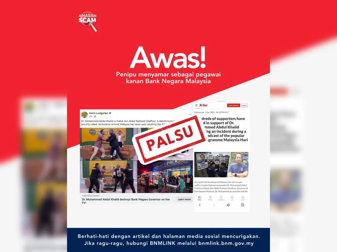 BNM turut menegaskan orang ramai perlu lebih berwaspada terhadap penipuan dalam talian yang semakin berleluasa, khususnya yang menggunakan nama tokoh atau institusi bagi memperdaya mangsa.