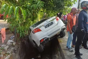 Kereta Perodua Bezza terbabit turut terbabas sebelum masuk ke dalam longkang sama.