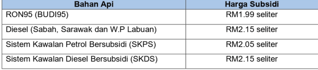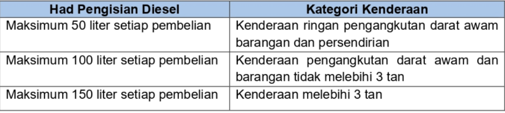 Bermula 1 April 2026, had kelayakan BUDI95 diselaraskan kepada 200 liter sebulan. Pelarasan ini merupakan langkah sementara sehingga keadaan bekalan global kembali stabil. Selain itu, Kerajaan turut melaksanakan had pengisian diesel bagi mengekang ketirisan dan penyeludupan di Sabah, Sarawak dan W.P. Labuan seperti berikut: