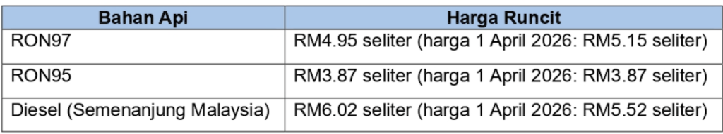 Justeru, usaha mengekalkan harga petroleum bersubsidi kepada rakyat serta sektor tertentu akan terus diperkukuh bagi membendung kenaikan harga barangan dan melindungi kesejahteraan rakyat. Selaras dengan formula Automatic Pricing Mechanism (APM), harga runcit petrol dan diesel bagi tempoh 2 April hingga 8 April 2026 adalah seperti berikut: