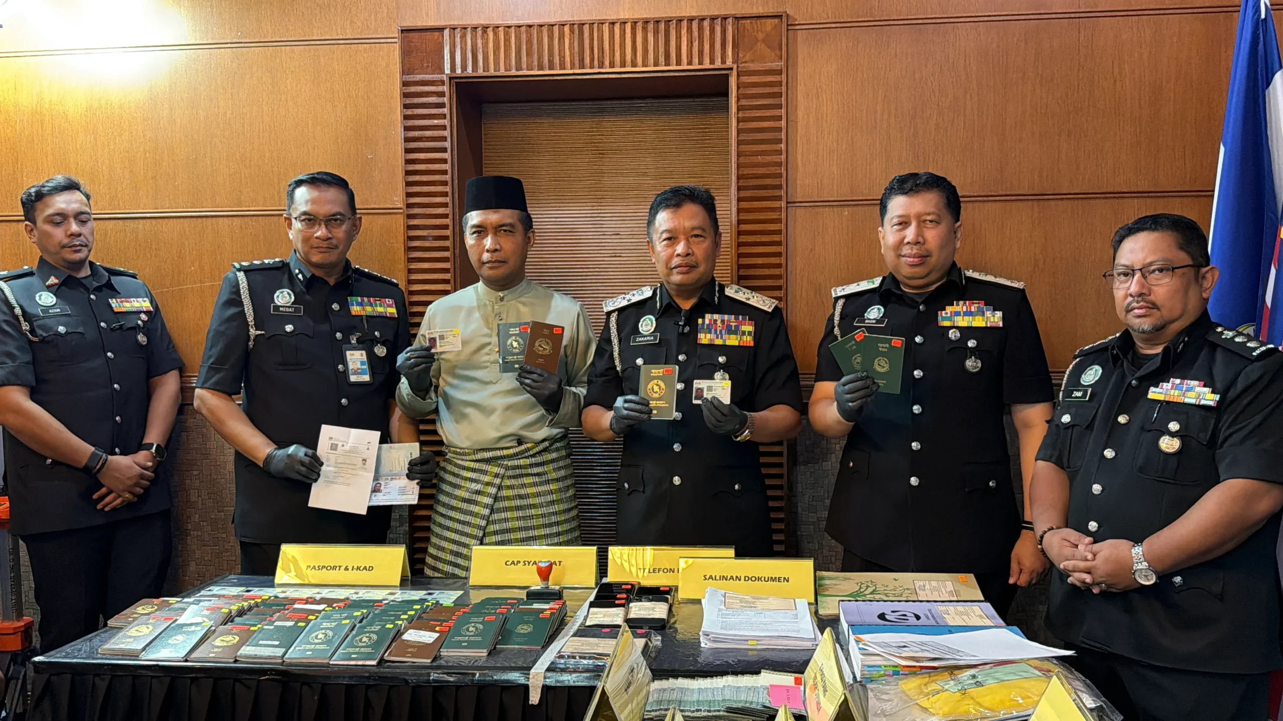 “Turut dirampas adalah 111 keping pasport pelbagai negara, 10 unit komputer riba, enam unit telefon bimbit dan wang tunai berjumlah RM3,950,” katanya dalam sidang media kejayaan Ops Serkap di ibu pejabat JIM di Putrajaya hari ini.