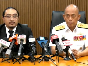 MUHAMMAD Firdaus Jumaluddin (kiri) bertindak sebagai jurucakap rasmi kepada Laksamana Madya Datuk Sabri Zali dalam sidang media khas di Puspahanas, Putrajaya hari ini
