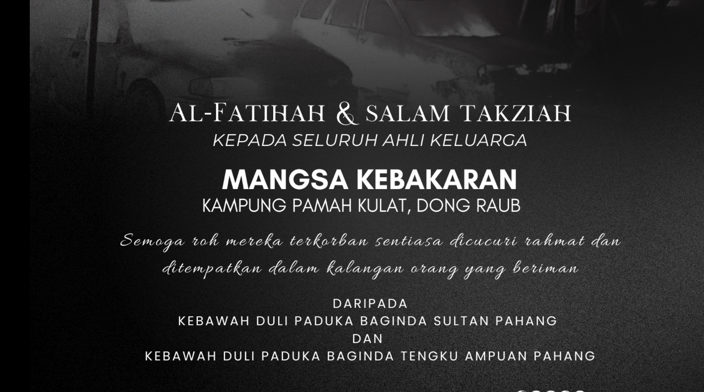 SULTAN Pahang Al-Sultan Abdullah Ri’ayatuddin Al-Mustafa Billah Shah dan Tengku Ampuan Pahang Tunku Azizah Aminah Maimunah Iskandariah menzahirkan sedalam-dalam ucapan takziah kepada waris lima sekeluarga yang meninggal dunia dalam tragedi kebakaran di Kampung Pamah Kulat, Dong, Raub awal pagi tadi.
