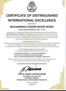 “Pengiktirafan berprestij ini dianugerahkan sebagai penghormatan terhadap sumbangan cemerlang dalam sepak takraw antarabangsa, komitmen terhadap kecemerlangan serta integriti kesukanan, peranan dalam meningkatkan martabat sepak takraw Malaysia di peringkat global,” menurut kenyataan itu.