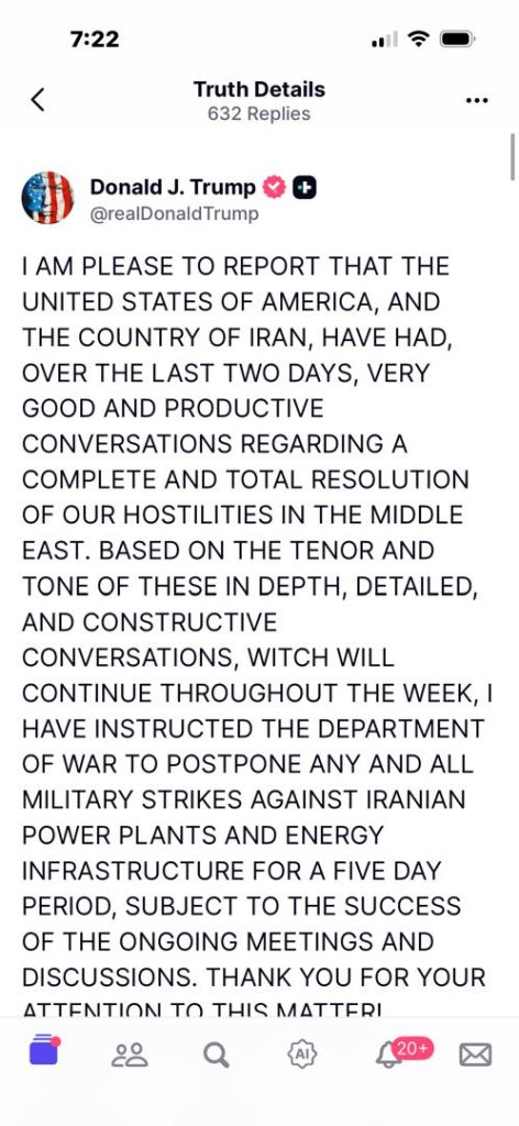 Sebelum itu dalam kenyataan tersebut Trump memaklumkan Amerika Syarikat dan Iran telah mengadakan perbincangan yang “sangat baik dan produktif” dalam tempoh dua hari lalu, berkaitan usaha mencapai penyelesaian menyeluruh terhadap konflik di Timur Tengah.