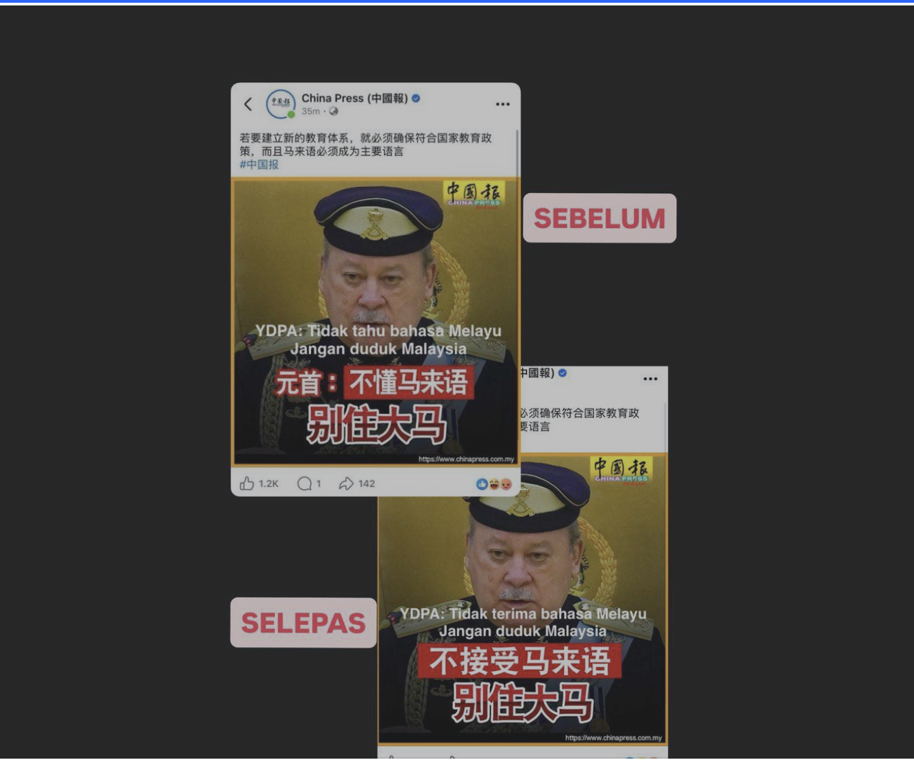 ‘’Tetapi apa yang ditulis oleh China Press ialah; “Tidak tahu bahasa Melayu, jangan duduk Malaysia” Jauh beza makna ayat tidak tahu & tidak terima. ‘Thumbnail’ tajuk berita tulis “Tidak tahu bahasa Melayu, jangan duduk Malaysia” tetapi tajuk di dalam artikel pula, “YDPA: Untuk iktiraf sistem pendidikan lain, mesti terima Bahasa Melayu dan sejarah”,’’ kata Firdaus.